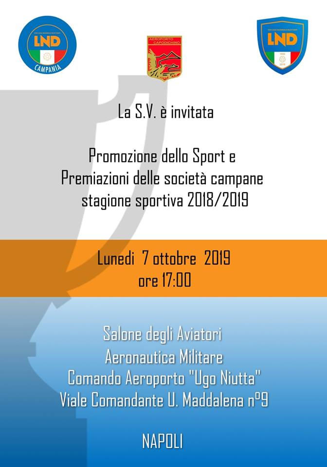 Lunedì 7 ottobre alle 17 presso il Salone degli Aviatori del Comando Aeroporto “Ugo Niutta”, in viale Comandante Umberto Maddalena 9, si terrà la promozione dello sport e la premiazione delle società campane della provincia partenopea del 2018-2019, a cura della LND Campania.