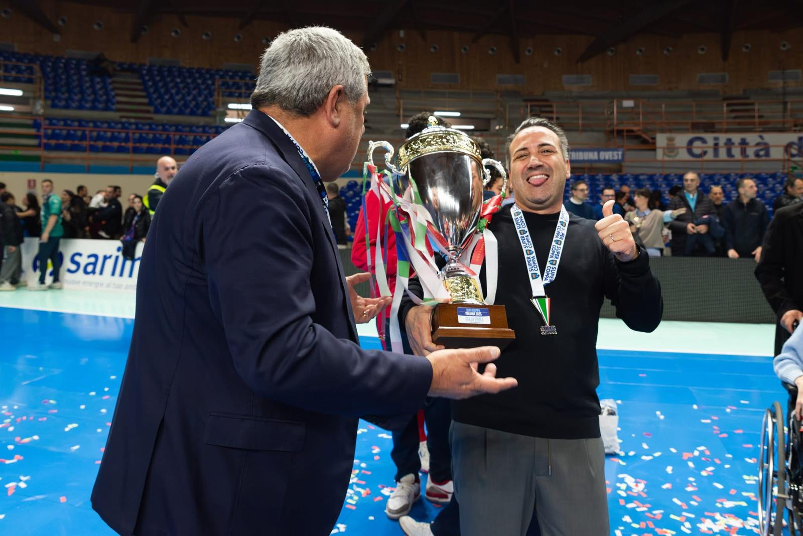 COMPETERE X EMOZIONARE – “Un sogno aver conquistato un trofeo davanti alla nostra gente, questa vittoria resterà indelebile nella memoria di tutti perchè conquistata insieme come una grande famiglia, il supporto di Eboli è stato fondamentale per alzare il trofeo. Un ringraziamento a mister Antonelli, ai giocatori e a tutto lo staff che lavora ogni giorno per mettere la squadra nelle condizioni migliori. Tutti hanno contribuito a questa vittoria, ognuno ci ha messo un pezzetto nel suo ruolo, solo così si ottengono vittorie importanti. Godiamoci questa serata, anche se le nostre ambizioni non si fermano qui. Siamo riusciti non solo a competere ma anche ad emozionare, per me questa è la vittoria più grande, un popolo in festa, una vittoria ottenuta tutti insieme. Ci tengo a ricordare che la Feldi c’è, c’era e ci sarà”, le parole di un emozionato presidente Gaetano Di Domenico.