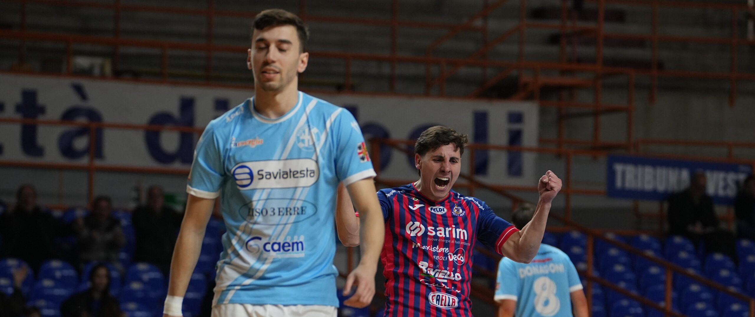 In attesa del derby del Pala Del Mauro, la Feldi torna a sedere sul gradino più basso del podio a quota 39. Si rimette in marcia al PalaSele la squadra di Antonelli contro il Saviatesta Mantova. Il primo tempo è tutto di marca campana con Gui, Caponigro e Calderolli. Prima dell’intervallo Mohabz si becca anche il rosso. Dopo 2’07” della ripresa il 3-1 di Mascherona, nuovamente distanziato dal 4-1 con un’autorete lombarda. Ancora Mascherona con la firma del 4-2 ed il 4-3 di Leleco, è China Calderolli a ricacciare indietro gli avversari (5-3). Chiude i giochi Mateus con il sigillo del 6-3.