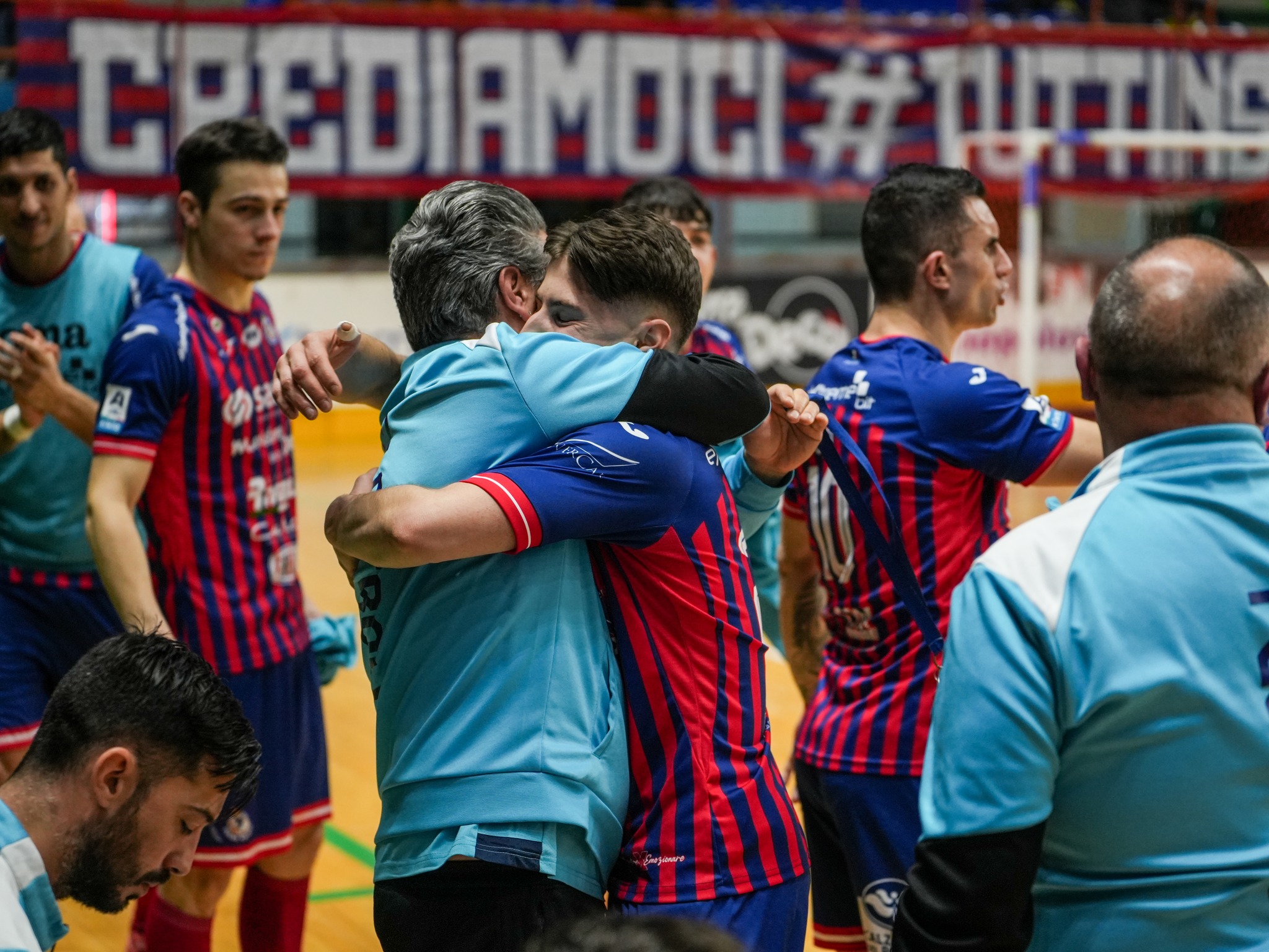 Nella ripresa la musica non cambia. Dopo pochi minuti la Feldi cala il tris con una giocata da applausi: Lavrendi devia di tacco un tiro di Mateus e batte ancora Molitierno per il 3-0. Tiago Lemos sfiora il poker e il suo primo gol stagionale, mentre il Pomezia tenta di rendersi pericoloso con un tiro dalla distanza di Raubo. Con poche idee e ancor meno occasioni, i laziali optano per il portiere di movimento già a metà secondo tempo. La scelta, però, espone ulteriormente la squadra ospite agli attacchi rossoblù. Lavrendi centra la traversa, Gui non trova il bersaglio per questione di centimetri, ma il quarto gol è solo questione di tempo. A firmarlo è proprio Tiago Lemos, che trova finalmente la rete tanto attesa e scoppia in lacrime per l’emozione, travolto dall’abbraccio dei compagni e dall’ovazione del pubblico. Un momento che vale quanto una qualificazione. Pochi secondi più tardi arriva anche il sigillo definitivo: Echavarria completa la tripletta personale, raggiungendo la doppia cifra stagionale in tutte le competizioni, quarto giocatore rossoblù a riuscirci dopo Calderolli, Felipinho e Gui.