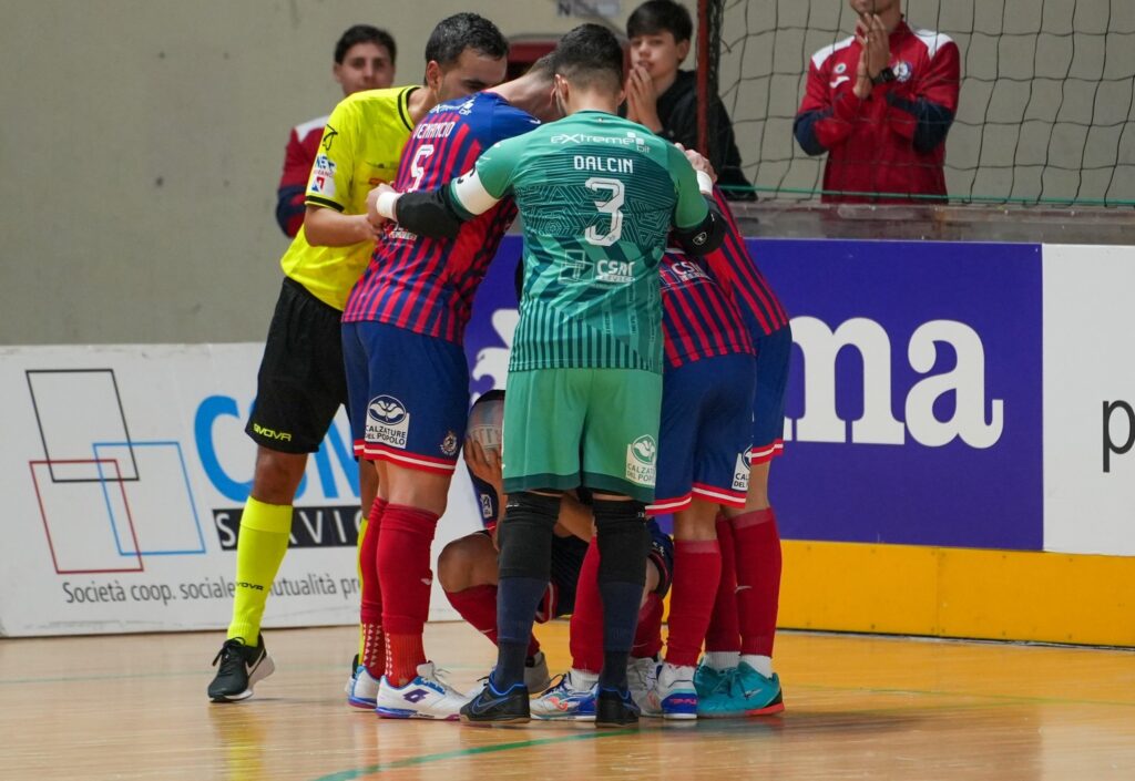 L’avvio è subito di marca rossoblù. Selucio ci prova dalla distanza, poi è Venancio a cercare la soluzione, mentre la Feldi alza progressivamente il ritmo. Felipinho colpisce il palo nei primi minuti, dando il primo segnale della serata e poco dopo Molitierno si supera su Mateus evitando il vantaggio immediato. C’è spazio anche per il ritorno in campo di Tiago Lemos, rientrato dopo mesi di lungodegenza. Il punteggio si sblocca a metà primo tempo con un’azione di Dalcin che avanza palla al piede fino ai pressi dell’area avversaria, calcia, Molitierno respinge ma sulla ribattuta è Echavarria il più lesto di tutti a depositare in rete l’1-0. La Feldi continua a spingere e Mateus sfiora il raddoppio, mentre il Pomezia prova una timida reazione senza però riuscire a impensierire seriamente la retroguardia di casa. Nel finale di frazione arriva il 2-0: ancora Echavarria, che firma la doppietta personale e manda le squadre al riposo con le volpi saldamente in controllo.